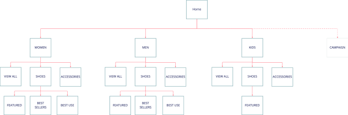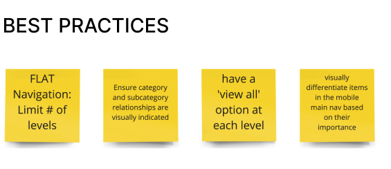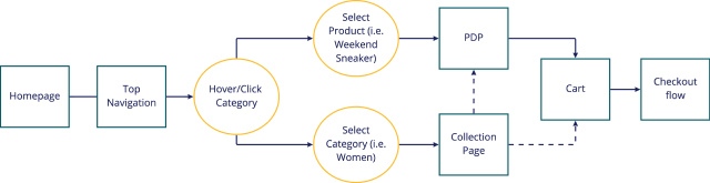 I began conducting my research by mapping out the current flow and analyzing the E2E experience. From there I looked at competitors to identify common themes across retail sites and other large brands with a robust global nav. The current experience had a lot of pain-points that we could improve right away: