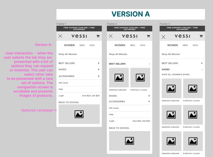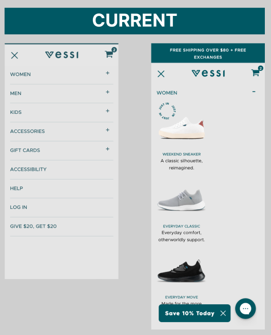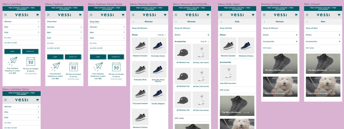 Stakeholders were pleased with the minimal, easy to use navigation updates. Within the first week we saw a conversion increase of 6%. I partnered with CX and customer feedback was positive. My Global Navigation Design I created is on the Vessi site.